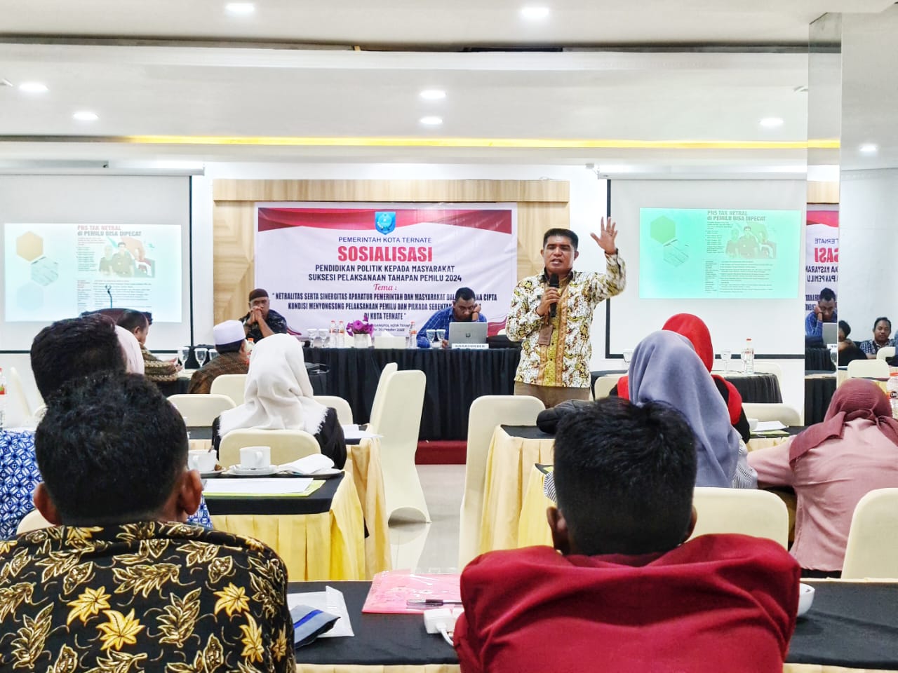 BKPSDM (20/10/2022),Kepala BKPSDM Samin Marsaoly,S.STP menghadiri sekaligus menjadi Narasumber dalam kegiatan Sosialisasi Pendidikan Politik kepada masyarakat dengan tema "netralitas serta sinergitas aparatur pemerintah dan masyarakat dalam rangka cipta kondisi menyongsong pelaksanaan pemilu dan pilkada serentak tahun 2024".